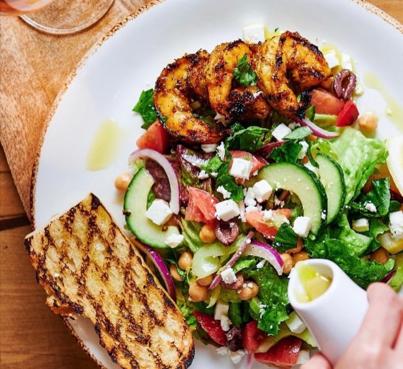 フェタチーズ、ハウラ・トマト、カラマタオリーブ、ホーファームキュウリ、カラブリアンチリ、レモンガーリックビネグレット、自家製カントリーブレッド