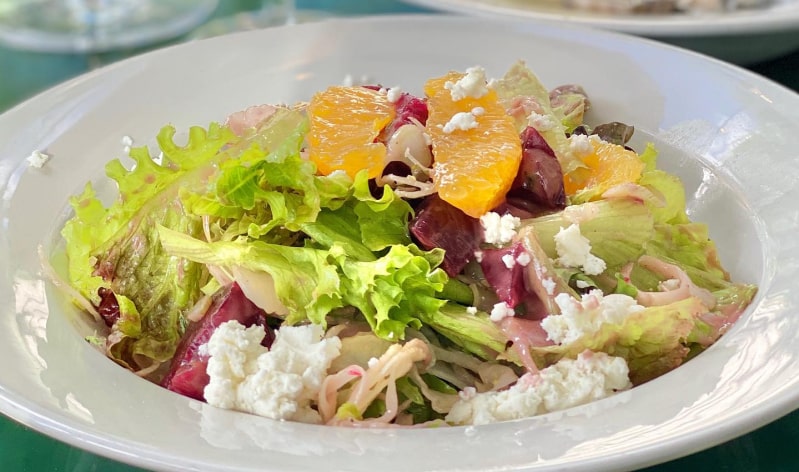 ヒラバラファーム・ミックスグリーン、ハワイ島ヤギ乳製品、シェーブル、オレンジ、ミント、コリアンダー、オレンジ・ジンジャー・ドレッシング