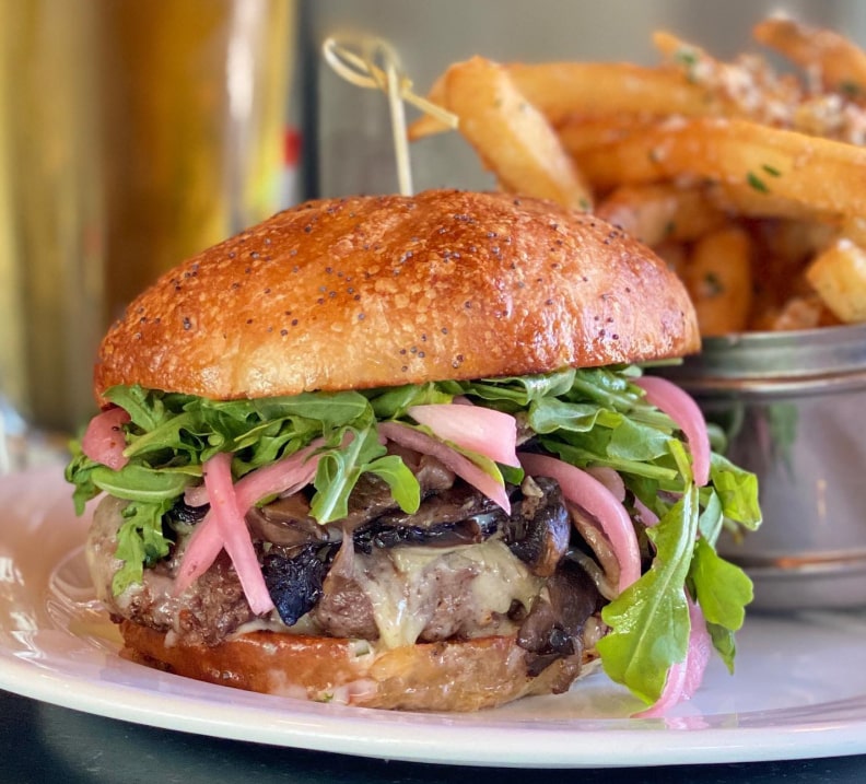 スネークリバーファームビーフ6オンス、ワイマナロマッシュルームソテー、グリュイエール、ルッコラ、トリュフアイオリ、ハウスメイドのカイザーバン