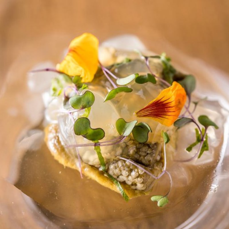 シェフズカウンター、ダイニングテーブル、テラスにて提供のテイスティングメニューの料理は季節によって変わります