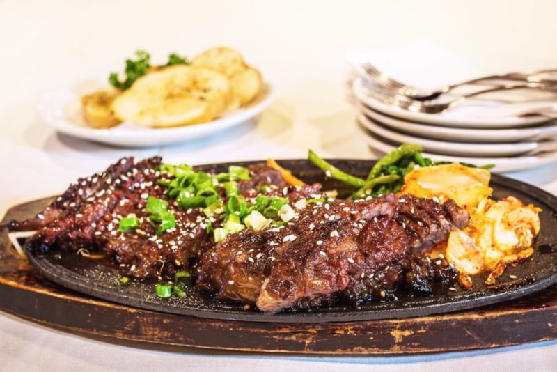 韓国風骨なしカルビを炭火で焼き、青菜とキムチ炒めにかけてお召し上がりいただきます