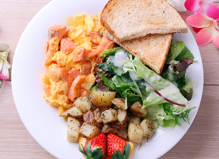 タマネギとスモークサーモンを入れたスクランブルエッグ