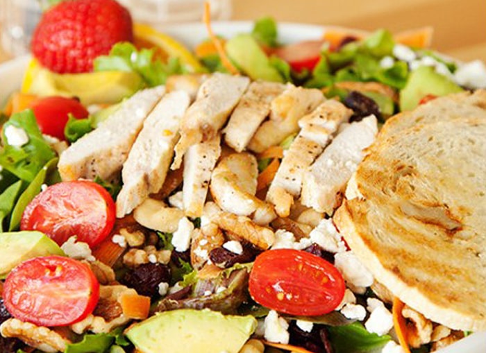 追加の詰め物:野菜 1ドル、アボカド 2ドル、朝食肉 2ドル、グリルチキン 3ドル