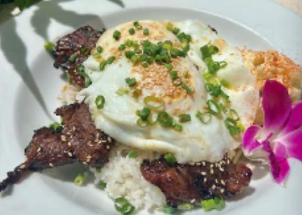 アヒポキにスパイシーアヒを振りかけ、ウナギのたれを振りかけてクリスピーフライドオニオンを添え、スチームライスの上にのせました