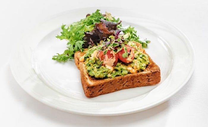 全粒粉・フラックスシードのパン、潰したアボカド、地元のミックスグリーン、チェリートマトのオイルマリネ、アラエアソルト