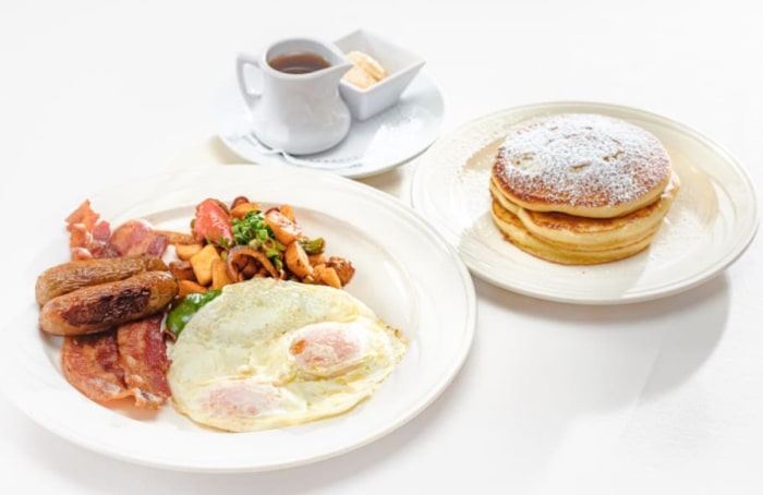 パンケーキ3枚、お好みの卵2個、M.A.C.ブレックファストポテト、アップルウッドスモークベーコン、リンクソーセージ