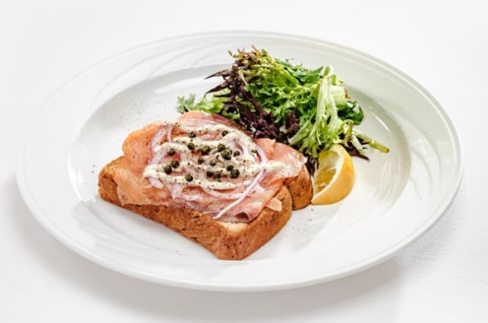 ノルウェー産スモークサーモン、トーストした小麦パン、ケーパー・レモン・生クリーム、削ったマウイオニオン、ブラックペッパー