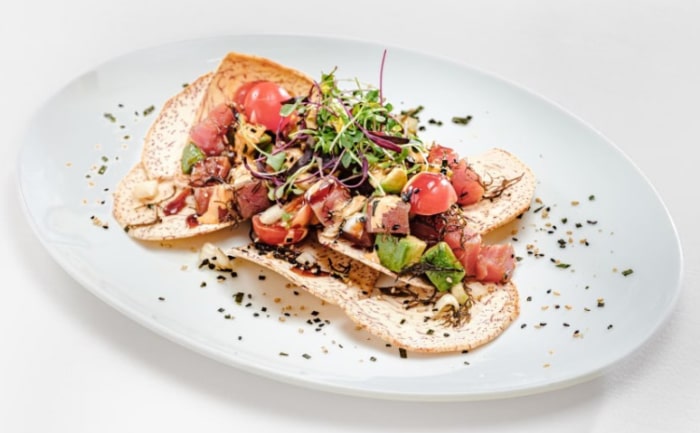 新鮮なアヒマグロの炙り、バター風味のフラックスシードブレッドトースト、枝豆のフムス、チェリートマトのオイルマリネ、マイクロバジルバルサミコリダクション