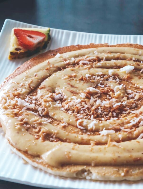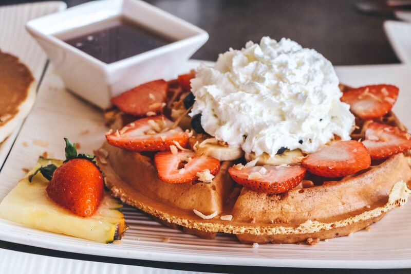 すべてのワッフルとパンケーキには、お好みのメープル シロップまたはココナッツ シロップが添えられます