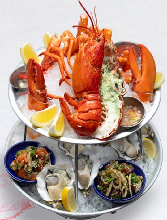 生牡蠣 6 個、カウアイシュリンプカクテル 4 尾、サクラマス 6 ピース、アヒ ポケ、スパイシー アヒ ポケ、丸ごとロブスター、ズワイガニの足、カクテルソース、スイートオニオンミニョネット、くし切りレモン添え