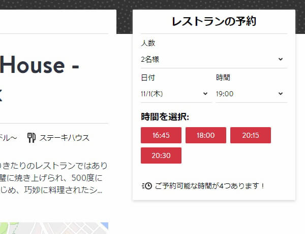 2名で11月1日の午後7時から予約をしようと調べましたら予約はできず、空いていて予約ができる時間は16:45、18:00、20:15、20:30と表示されました。