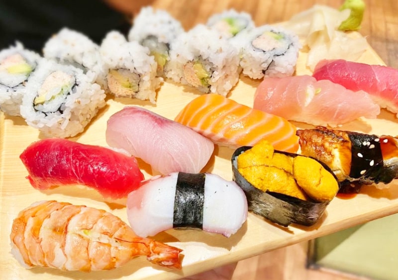 カリフォルニアロール、まぐろ、海老、サーモン、はまち、うなぎ、うに、たこ、さば、中とろ、味噌汁