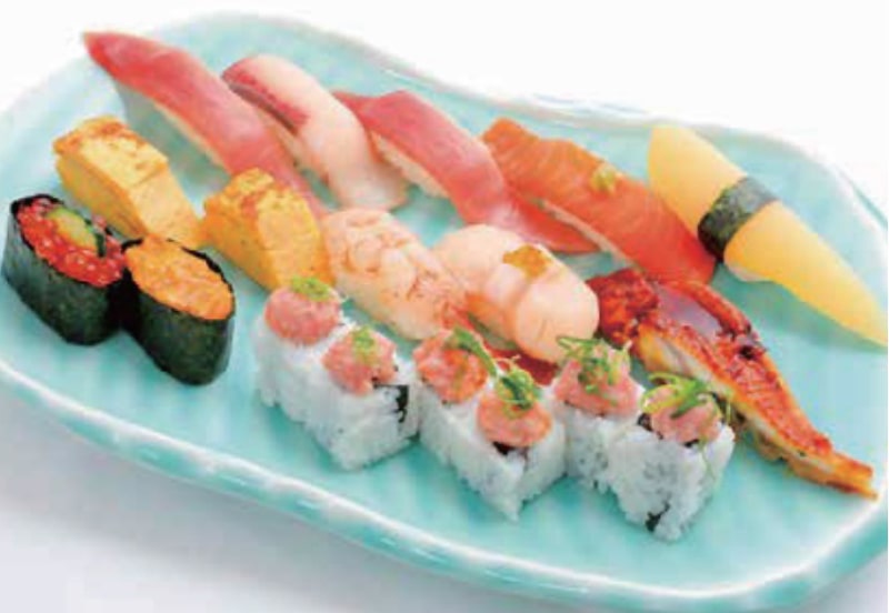 中トロ2貫、ハマチ、サーモン、数の子、玉子、大赤海老、ホタテ、うなぎ、いくら、うに、ネギトロ巻