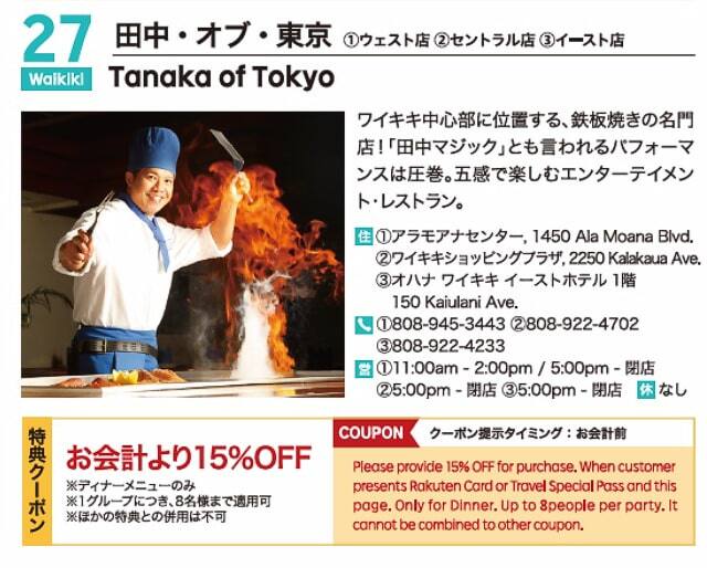 ハワイで人気の鉄板焼きレストランの田中オブ東京のメニューは次となっています。
