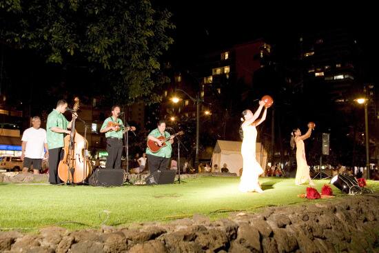週末には地元で有名なフラ教室の舞台があり、ステージ前は結構混雑しますので良い場所でじっくりフラを見て楽しみたいのでしたら早めに場所取りをすることをお薦めします。