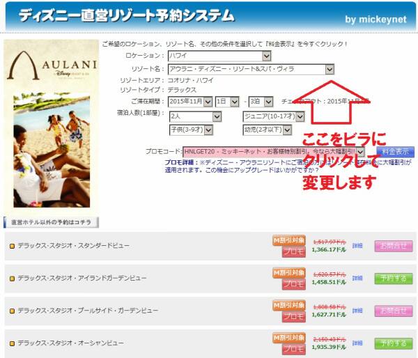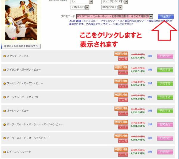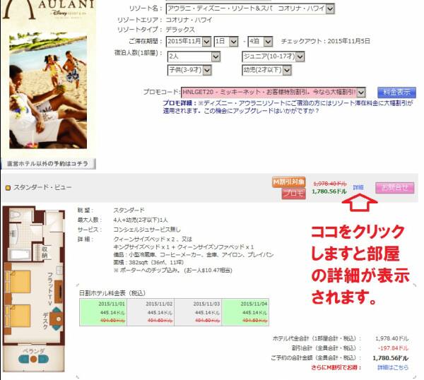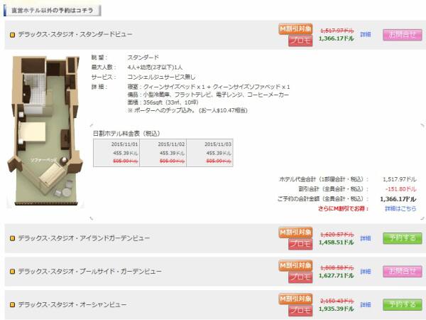 そして「M割引対象」という表示がありますが、これは申込金25ドルで予約して、残金を日本円で日本国内の銀行に振り込みをするなどの支払いを行いますと、残金が2%安くなるといったもので、ミッキーネットM割引プランと呼ばれています。