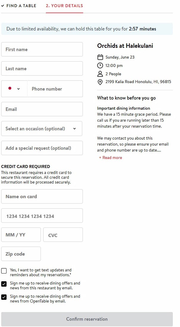 そうしますと名前と電話番号、Eメールアドレス,、クレジットカード情報などを記載するフォームになりますので、こちらに記入しましたら「Confirn reservation」を押せば予約が完了となります。