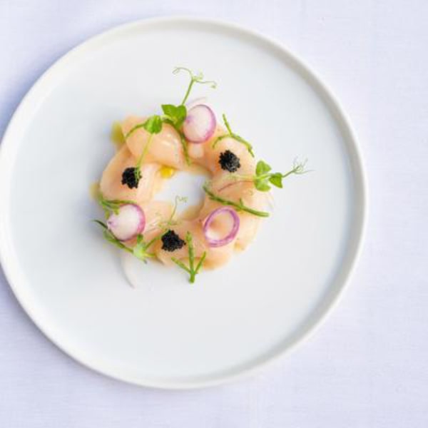 北海道産ホタテの刺身、ウニ、赤玉ねぎ、トビコをシャンパンドレッシングで
