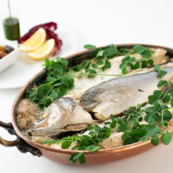 塩の衣でオーブン焼きした丸ごとスズキ | テーブルサイドで提供されるフィレ2切れに、ローストローズマリーポテトとハーブソースを添えて