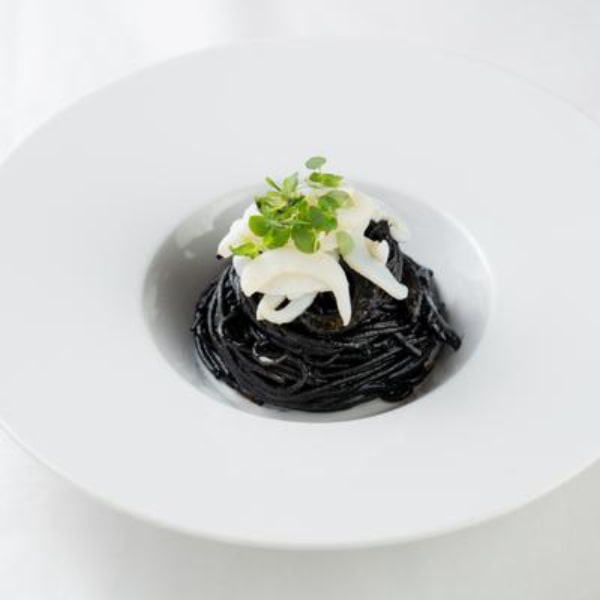 タリアテッレ・アイ・フルッティ・ディ・マーレ - 手打ちタリアテッレ、青エビ、北海道産ホタテ、軽いトリュフオイル、レモンガーリック白ワインソース (アラカルトサイズ + 10ドル)