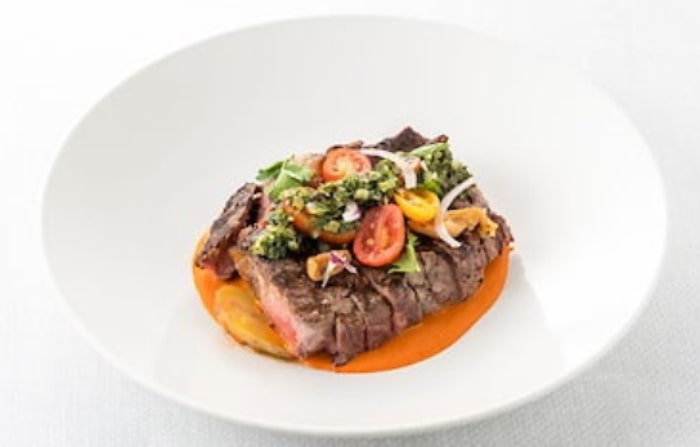 エアルームトマト、しそ、ストロベリー、紫玉ねぎ、マカデミアナッツペストソース、白バルサミコ酢