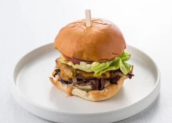 和牛パティ、トーストしたブリオッシュ、チェダーチーズ、レタス、トマト、玉ねぎのピクルス、マンゴーBBQアイオリソース