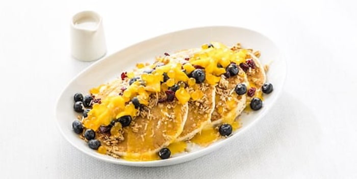 フレッシュなマンゴーの果肉、 リリコイ・バタークリーム、 カウアイ産グラノーラ、ココナッツ・ハウピアシロップを添えて