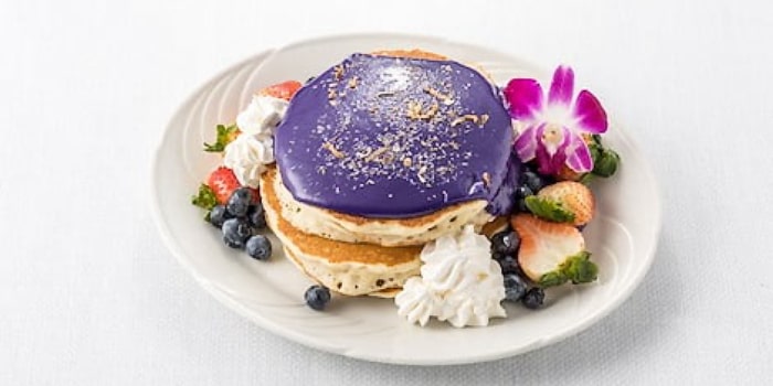 4枚のバターミルクパンケーキ、ウベソース、トーストしたココナッツのトッピング、ホイップクリーム、新鮮なベリー