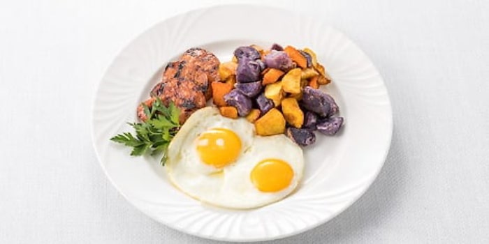 卵3個(お好みの調理法で)、ブレックファーストポテト、スモークベーコンまたはポルトガルソーセージのグリル