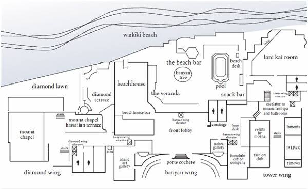 モアナサーフライダーのホテル内の図は下記のようになっていて、オンザビーチの立地が楽しめることがよくわかります。