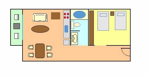 部屋のレイアウトは1ベッドルーム1バスルームとなっていて、クイーンサイズベッド1台またはツインベッド2台で、リビングルームにはソファベッドがあり部屋の広さは約50㎡で最大5人まで宿泊できます。