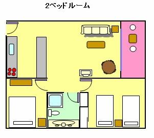 2ベッドルーム 1バスルームの間取りの一例はつぎのようになっています。
