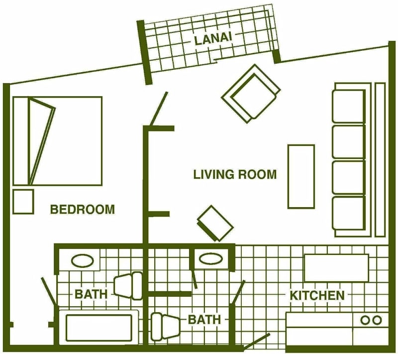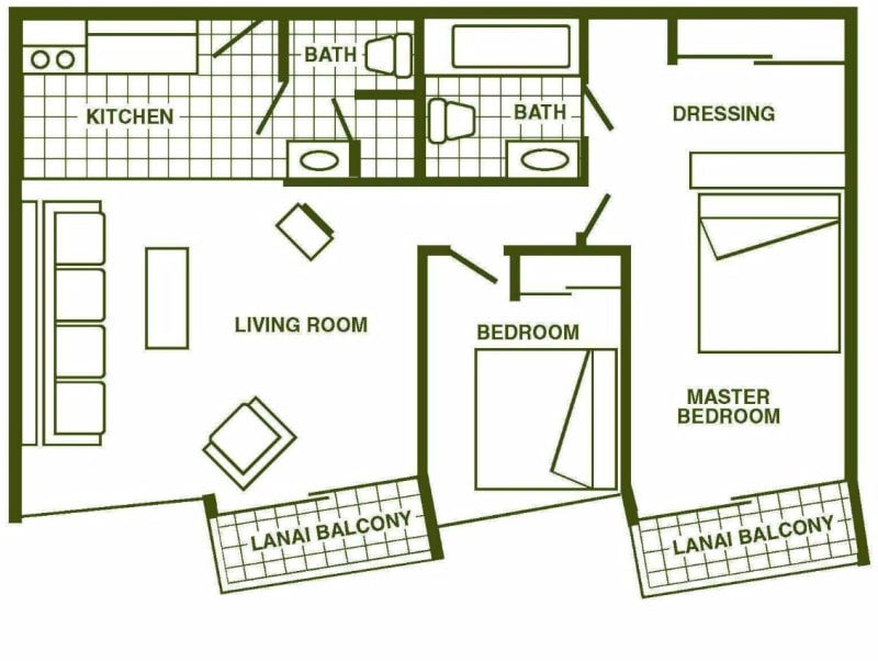 マスターベッドルームにクイーンベッド1台、セカンドベッドルームにクイーンベッド1台、ラナイ付きのリビングルームにクイーンソファベッドがあり、フルキッチン付きリビングエリアがある広さ65㎡の部屋
