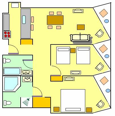 ダブルベッド2台、キングベッド1台、クイーンサイズソファー1台でフルキッチンのある部屋でバスルームは2つです